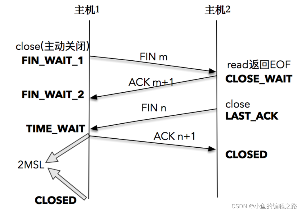 TCP 连接终止时,主机 1 先发送 FIN 报文,主机 2 进入 CLOSE_WAIT 状态,并发送一个 ACK 应答,同时,主机 2 通过 read 调用获得 EOF,并将此结果通知应用程序进行主动关闭操作,发送 FIN 报文。主机 1 在接收到 FIN 报文后发送 ACK 应答,此时主机 1 进入 TIME_WAIT 状态。