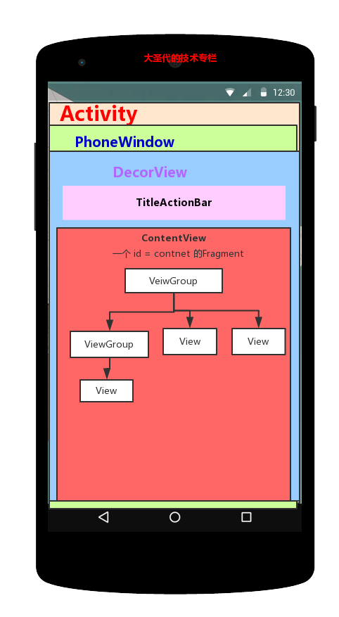 由此就组成了我们在《【Android 控件架构】详解Android控件架构与常用坐标系》一篇中提到的视图框架(图中contentView就是源码中的contentParent)