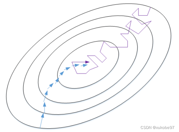 原始的梯度下降算法如上图蓝色折线所示。在梯度下降过程中,梯度下降的振荡较大,尤其对于W、b之间数值范围差别较大的情况。此时每一点处的梯度只与当前方向有关,产生类似折线的效果,前进缓慢。而如果对梯度进行指数加权平均,这样使当前梯度不仅与当前方向有关,还与之前的方向有关,这样处理让梯度前进方向更加平滑,减少振荡,能够更快地到达最小值处。