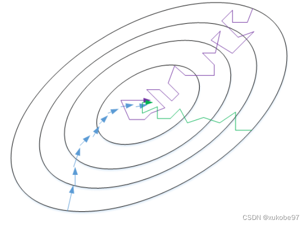 (9)实际使用中,mini-batch size不能设置得太大(Batch gradient descent),也不能设置得太小(Stachastic gradient descent)。这样,相当于结合了Batch gradient descent和Stachastic gradient descent各自的优点,既能使用向量化优化算法,又能叫快速地找到最小值。mini-batch gradient descent的梯度下降曲线如下图绿色所示,每次前进速度较快,且振荡较小,基本能接近全局最小值。