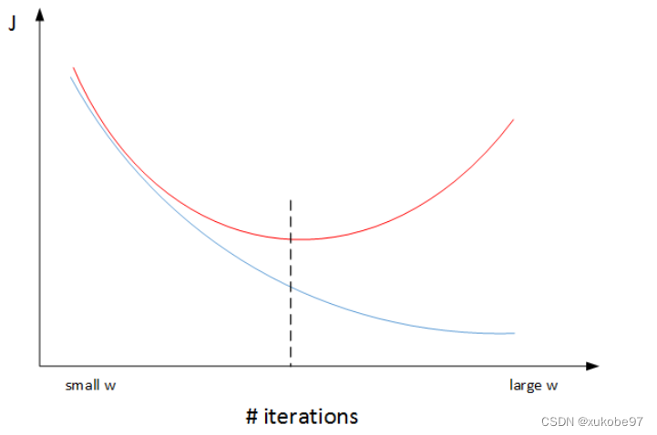 (2)还有另外一种防止过拟合的方法:early stopping。一个神经网络模型随着迭代训练次数增加,train set error一般是单调减小的,而dev set error 先减小,之后又增大。也就是说训练次数过多时,模型会对训练样本拟合的越来越好,但是对验证集拟合效果逐渐变差,即发生了过拟合。因此,迭代训练次数不是越多越好,可以通过train set error和dev set error随着迭代次数的变化趋势,选择合适的迭代次数,即early stopping。