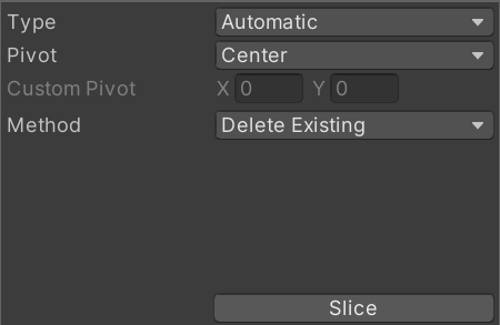打开 Sprite Editor,可看见如下界面。左上角的 Slice 表示如何对该图进行分割,其中的 Type 表示 Unity 切割该图片的类型