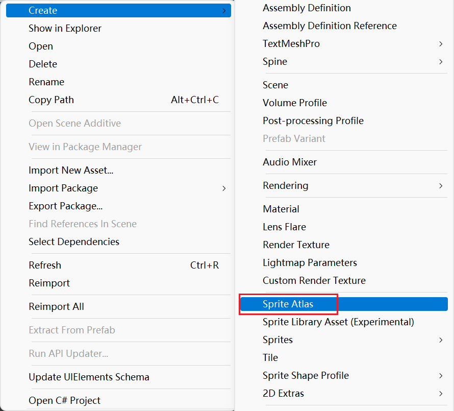 在 Project 窗口中右键选择 Create --> Sprite Atlas,创建图集