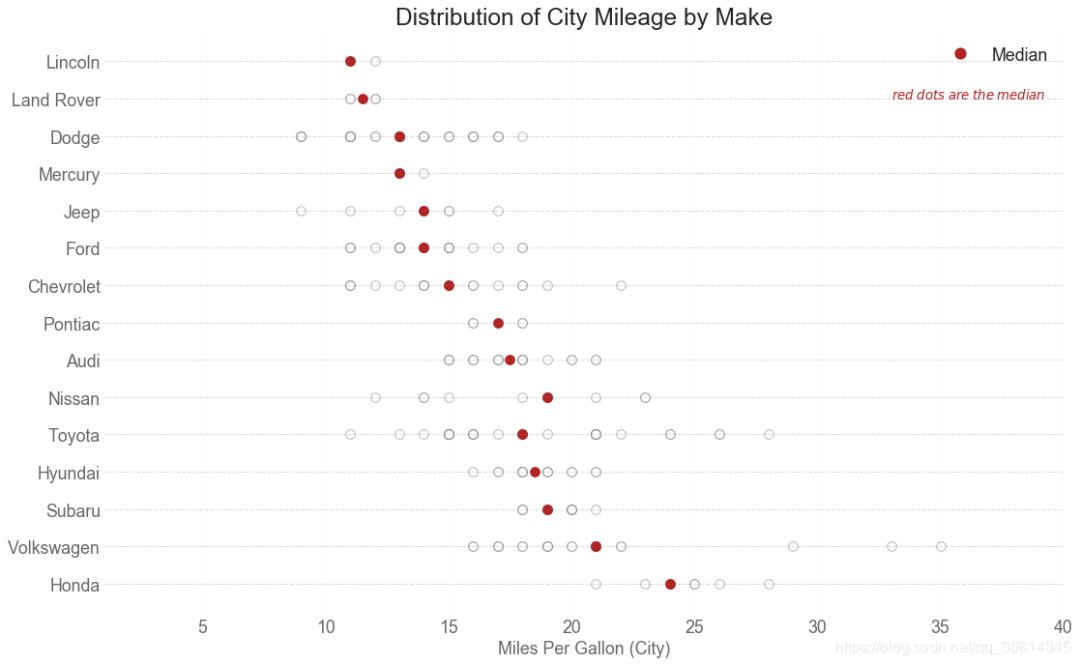 ax.scatter(y=i, x='cty', data=df_median.loc[df_median.index==make, :], s=75, c='firebrick')