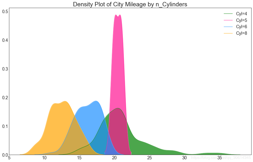 密度图是一种常用工具,可视化连续变量的分布。通过“响应”变量对它们进行分组,您可以检查X和Y之间的关系。以下情况,如果出于代表性目的来描述城市里程的分布如何随着汽缸数的变化而变化。