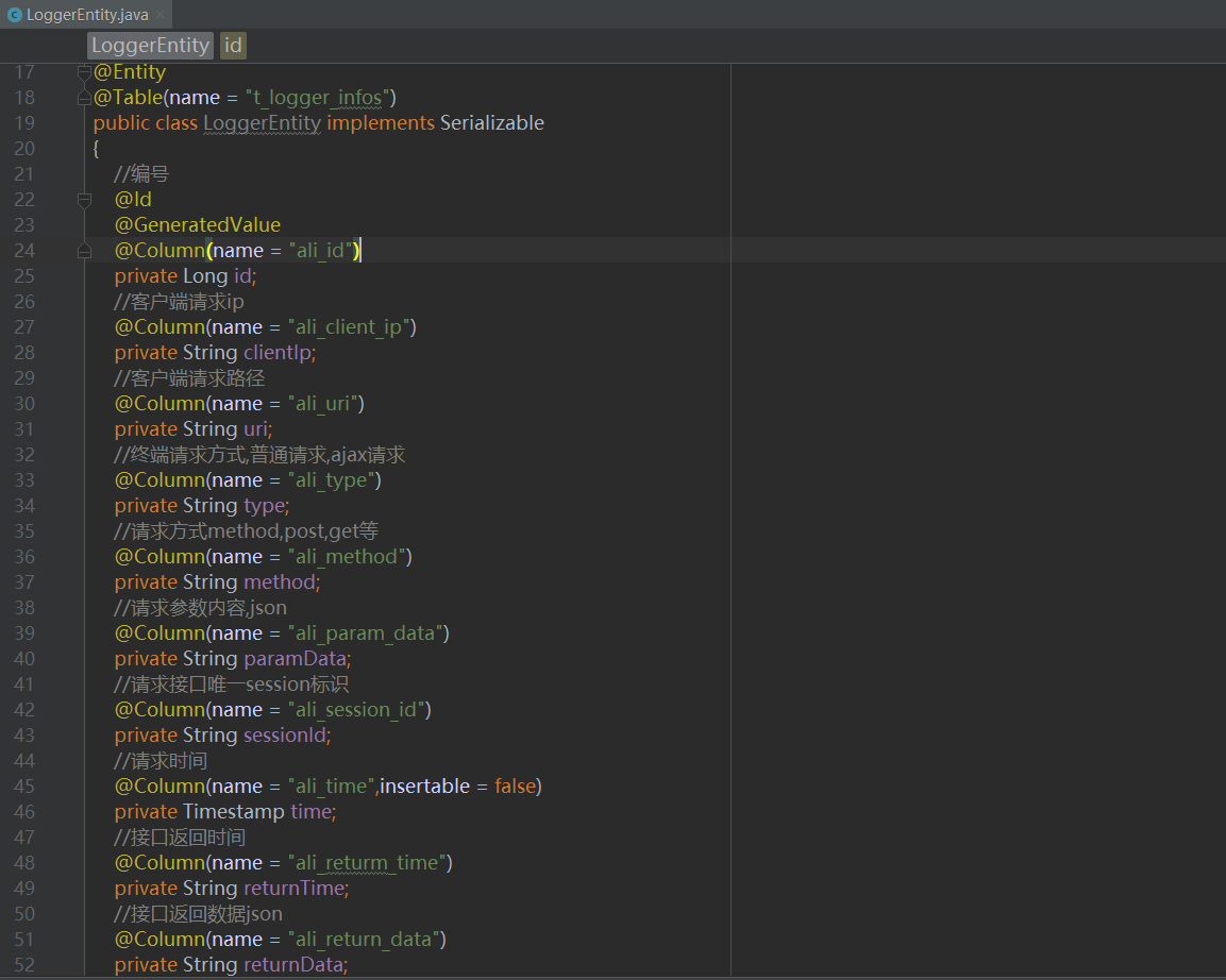 我们表结构内的字段比较多,数据结构创建完成后,接下来根据表结构创建实体并配置实体JPA,如下图所示: