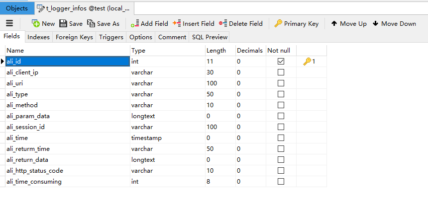 我们把请求日志直接保存到本地的MySQL数据库内,下面我们先来创建一个请求日志表,结构如下图所示: