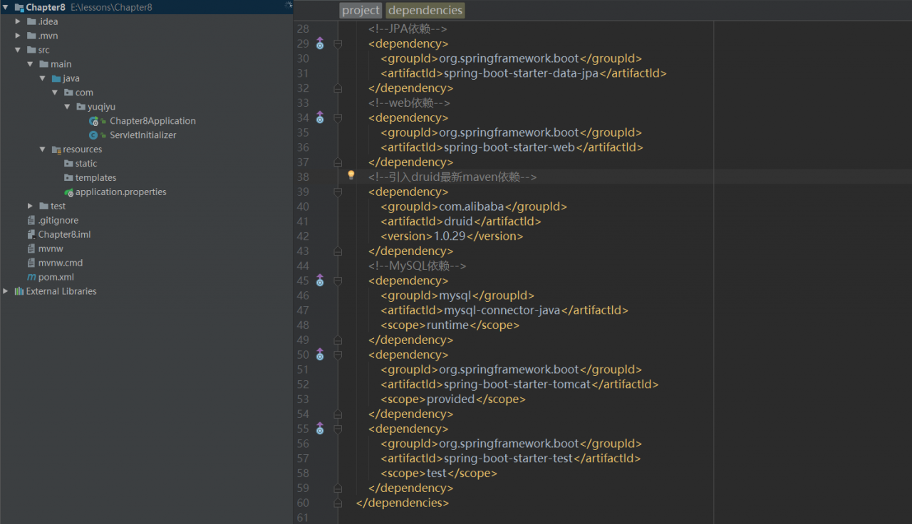我们使用InteiiJ IDEA创建一个SpringBoot项目,预先依赖模块有Web、JPA、MySQL、Druid等。项目结构如下图所示: