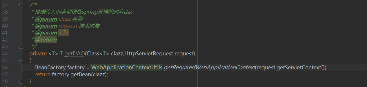 这个工具类可以通过HttpServletRequest请求对象的上下文(ServetCotext)获取Spring管理的Bean,具体代码如下图所示:
