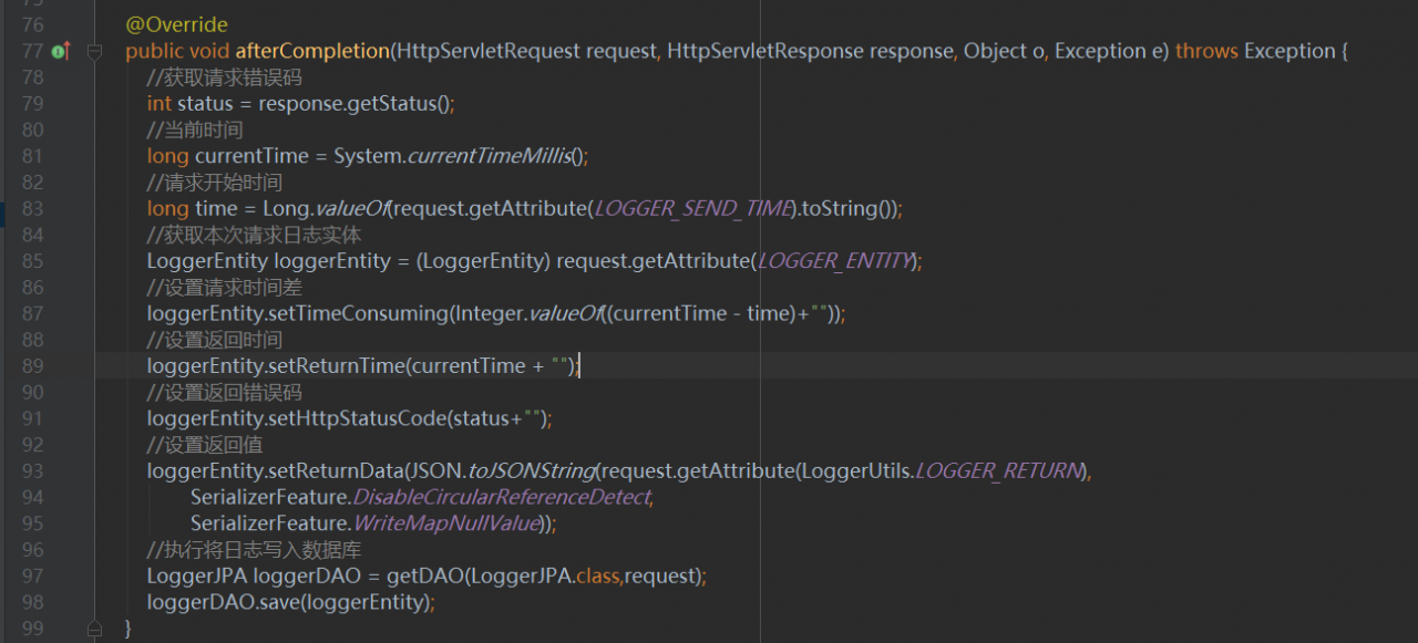 可以看到我们上面记录了我们日志实体内的大部分参数,当用户发送请求时在进入SpringMVC的控制器之前会进入preHandle方法,然后记录下我们的请求日志内容,并将请求日志的实体写入到请求对象内,下面就会进入对应springMVC控制器方法的方法,在最后渲染视图即将返回前台的时候开始执行我们下面需要边写的afterCompletion方法,代码如下图所示: