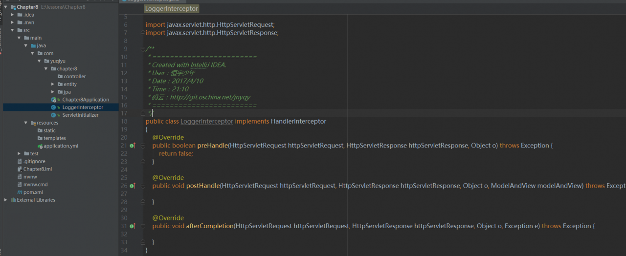 我们上面的步骤有关请求日志的存储已经编写完成,那么我们接下来需要编写一个请求日志的拦截器,自定义SpringMVC拦截器需要实现HandlerIntercptor接口,并且实现内部的三个方法,如下图所示拦截器代码详情: