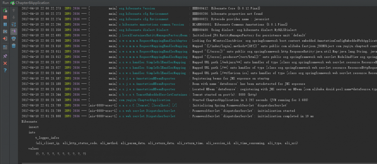 可以看到我们成功的返回了在IndexControll的login方法配置的json信息,那么我的请求日志是否已经记录到数据库呢?我们先来看下InteiiJ IDEA工具的控制器是否已经打印了SQL,如下图所示: