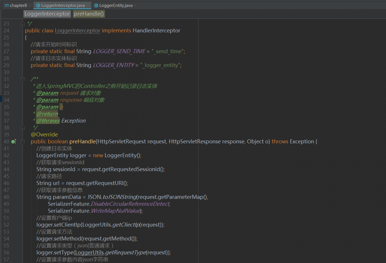 接下来我们开始编写请求日志的创建,首先我们在preHandle方法内创建LoggerEntity实体,并记录一些必要参数后将实体写入到当前请求对象HttpServletRequest内,如下图所示: