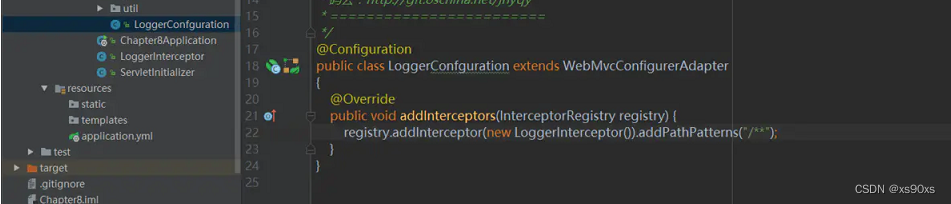 上述我们的代码基本已经编写完成,不要忘记最重要的一步,我们需要将LoggerInterceptor拦截器添加到我们的SpringBoot项目内,让SpringBoot项目可以识别拦截。我们需要创建一个LoggerConfguration配置类,如下图所示: