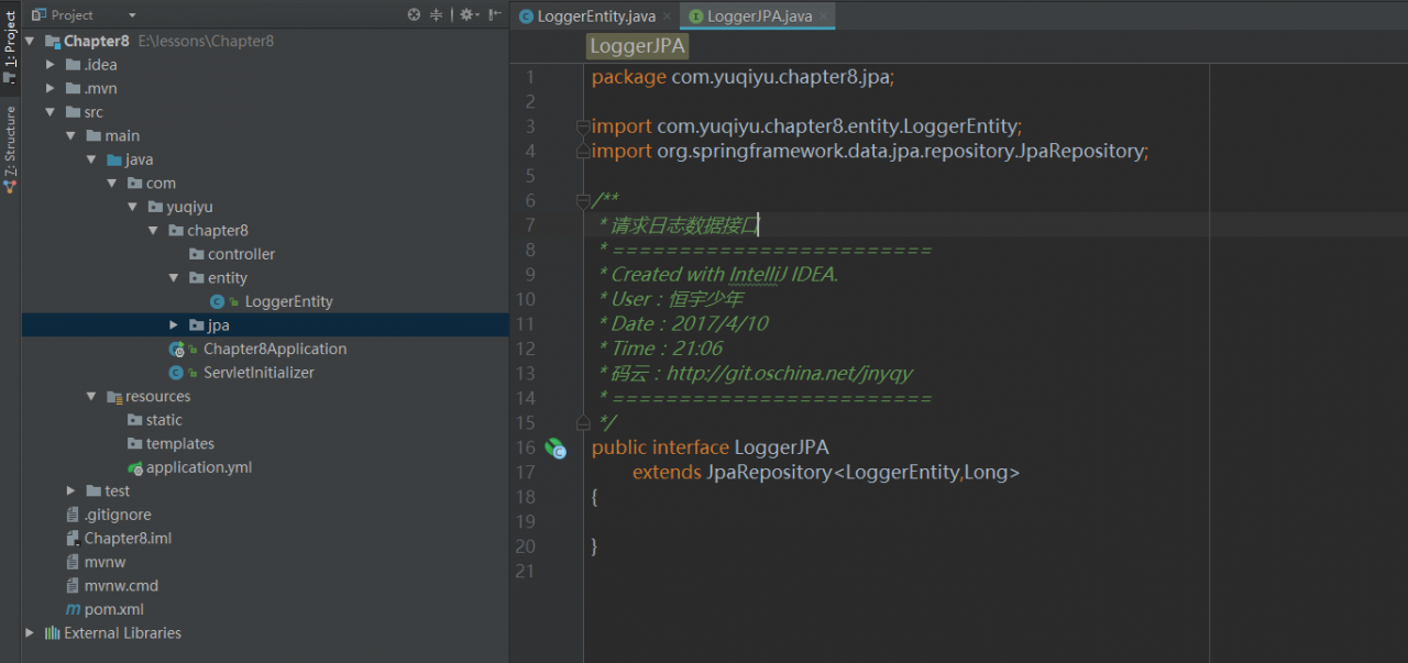 可以看到上图中,我们对应数据库内的表名以及字段名创建实体映射、字段映射,根据实体我们创建一个实现SpringDataJPA接口JpaRepository的子接口,LoggerJPA,如下图所示:
