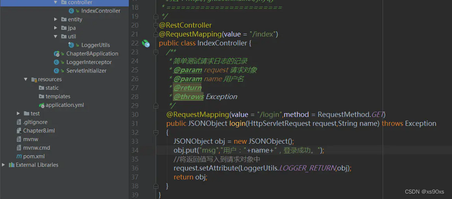 我们在IndexControll控制器内简单添加了一个测试方法login,可以看到我们在拦截器内的疑问得到的解释,LOGGER_RETURN是从我们的请求方法传入到LoggerInterceptor拦截器内afterCompletion方法中的。