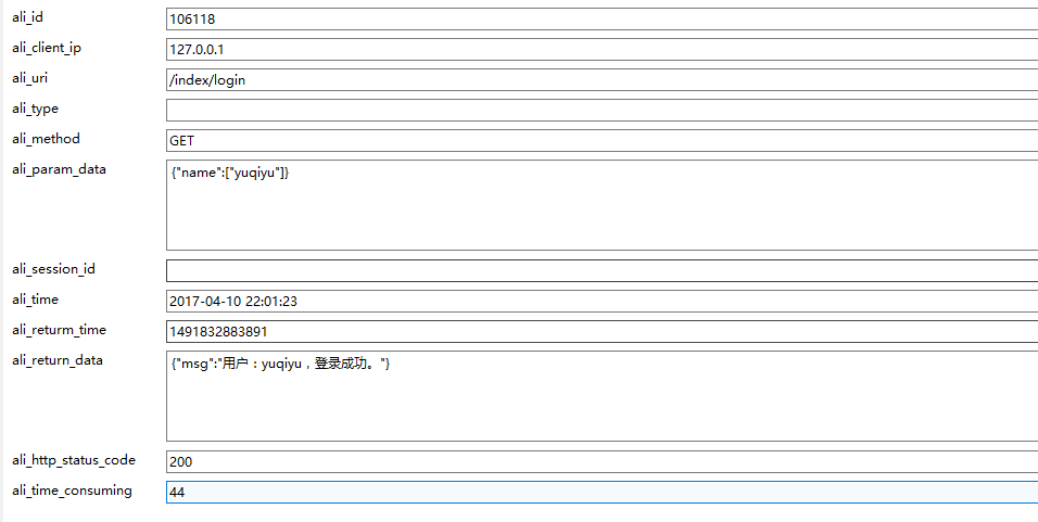 我们项目已经运行成功,那么我们接下来测试我们的请求日志是否可以记录成功,我们先来访问地址:http://127.0.0.1:8080/index/login?name=yuqiyu,效果如下图所示: