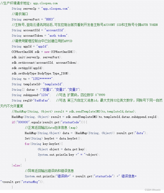 //HashMap<String, Object> result = sdk.sendTemplateSMS(to,templateId,datas);