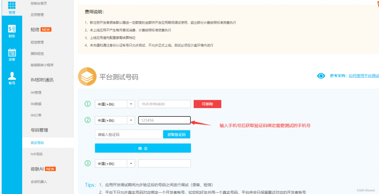 注意:这里只能填写三个测试号码,