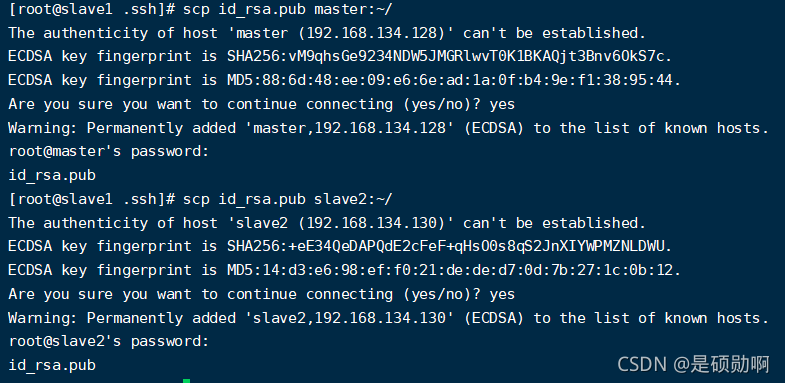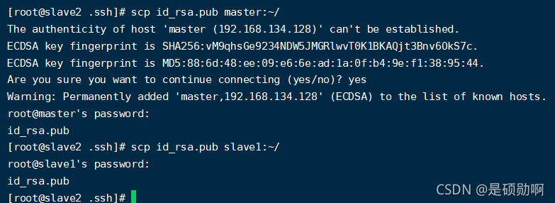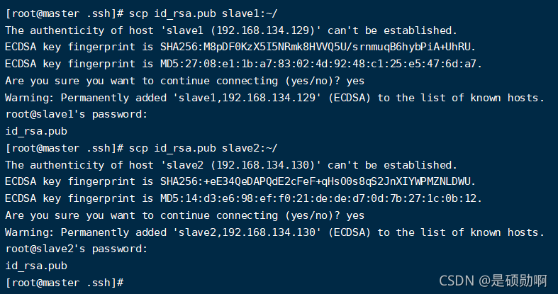 master:将公钥发送至slave1和slave2的用户目录下