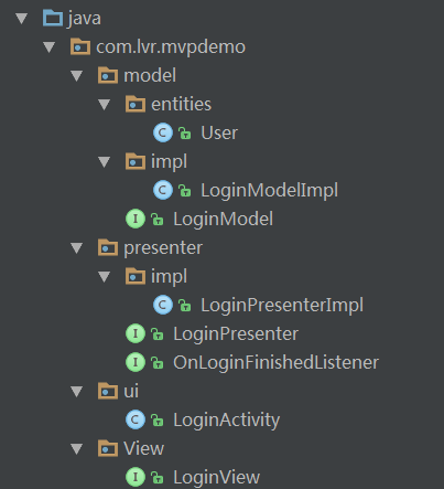 大多数MVP模式的示例都使用登录案例进行介绍。因为简单方便,同时能提现出MVP的特点。今天我们也以此例进行学习。 使用MVP的好处之一就是模块职责划分明显,层次清晰。 该例的结构图即可展现此优点。