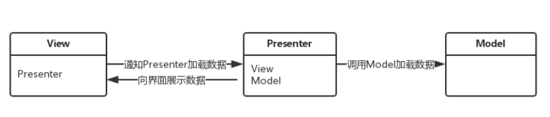 View与Model并不直接交互,而是使用Presenter作为View与Model之间的桥梁。其中Presenter中同时持有View层的Interface的引用以及Model层的引用,而View层持有Presenter层引用。当View层某个界面需要展示某些数据的时候,首先会调用Presenter层的引用,然后Presenter层会调用Model层请求数据,当Model层数据加载成功之后会调用Presenter层的回调方法通知Presenter层数据加载情况,最后Presenter层再调用View层的接口将加载后的数据展示给用户。