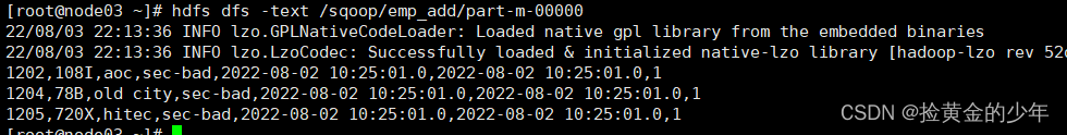 sqoop import --connect jdbc:mysql://node03:3306/userdb --password 123456 --username root --table emp --m 1