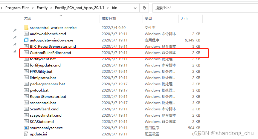 1). 在fortify SCA安装的bin目录下找到打开自定义规则编辑器,CustomRulesEditor.cmd,如下图所示: