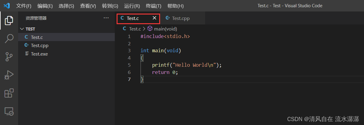 先来测试C语言,代码就是简单的输出Hello world。