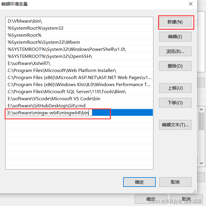 在编辑环境变量那里新建一个路径,并且把 mingw64 目录下 bin 文件夹的全路径复制粘贴过来,如下图。