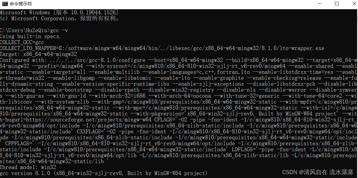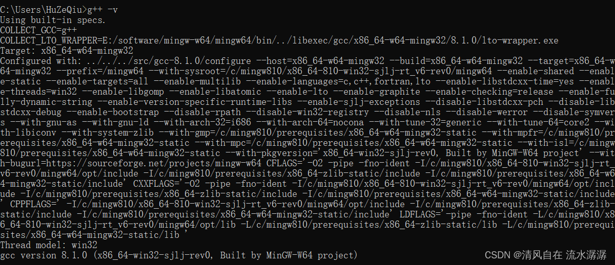 然后在命令行窗口分别输入gcc -v 和 g++ -v,效果如下,这就说明C语言和C++的编译环境已经配置好了。