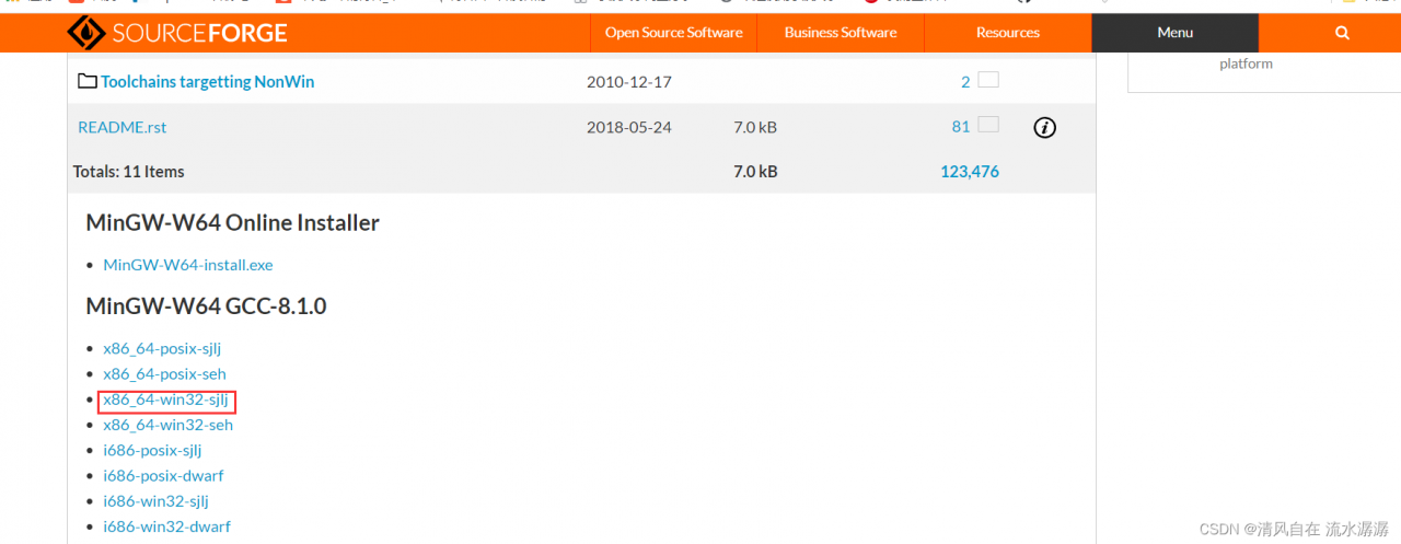进入MinGW-w64 - for 32 and 64 bit Windows Files官网,Files下面可以看到 x86_64-win32-sjlj,如图2所示,下载它。如果觉得下载的慢,我网盘里有链接。