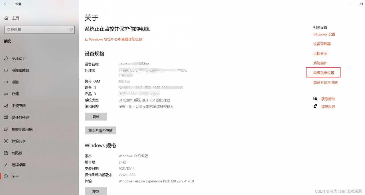 先点击开始,然后点击设置,再点击系统,在关于界面找到高级系统设置,点击它。