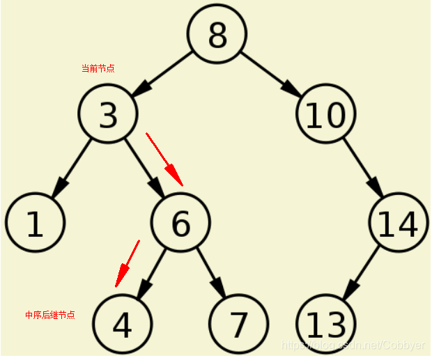 中序后继节点的找法:中续后继节点就是中序遍历结果中当前节点的后继节点。从当前节点的右子树开始,一直往右子树的左子节点找,一直到右子树的左节点的叶子结果,就为中序后继节点。