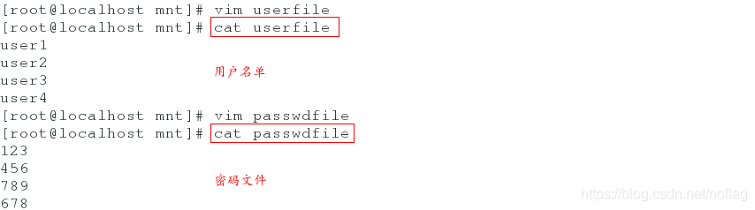 创建用户名单userfile和密码名单passwdfile