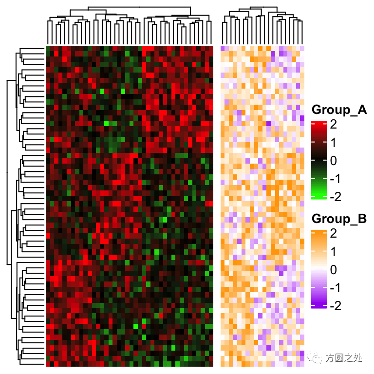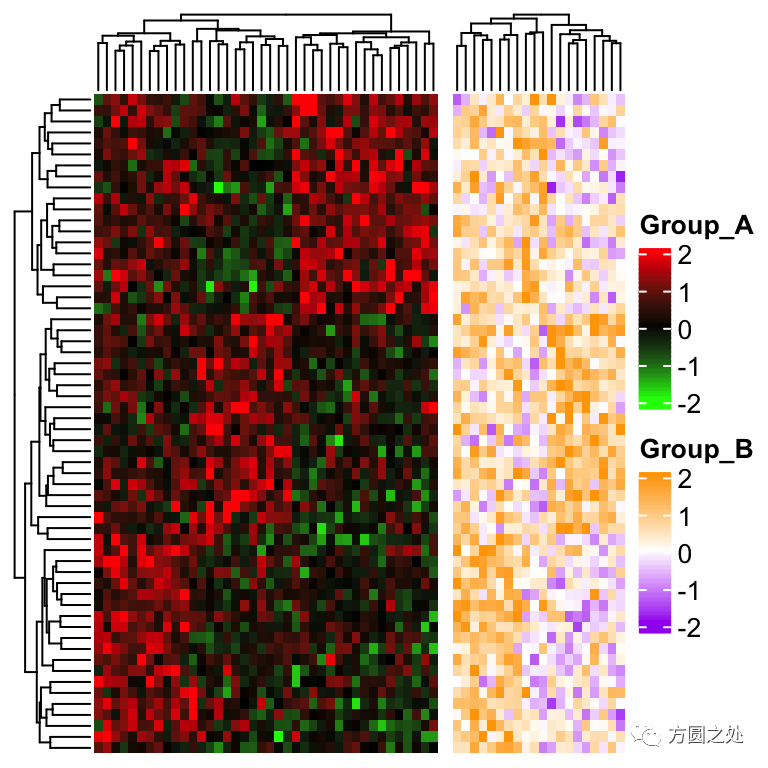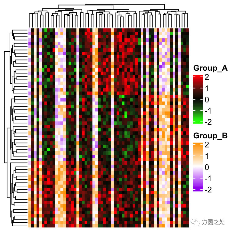在下面的例子中,我们假设热图在列上有两组,组A和组B。其中组A使用颜色:绿色-黑色-红色,组B使用紫色-白色-橘色。