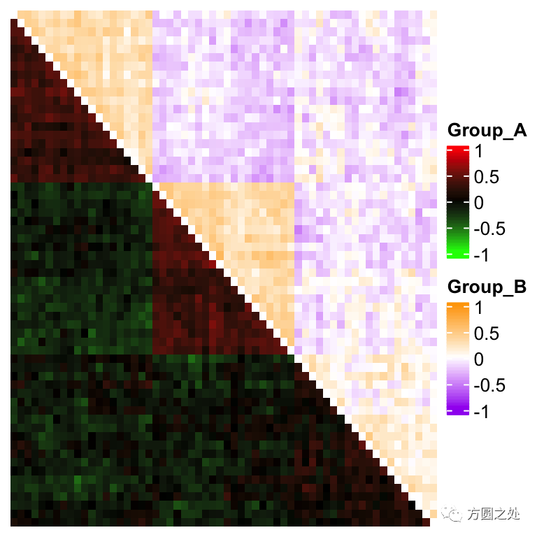 我们可以使用相同的方法对一个对称的矩阵添加两个不同的颜色主题(上三角矩阵和下三角矩阵):