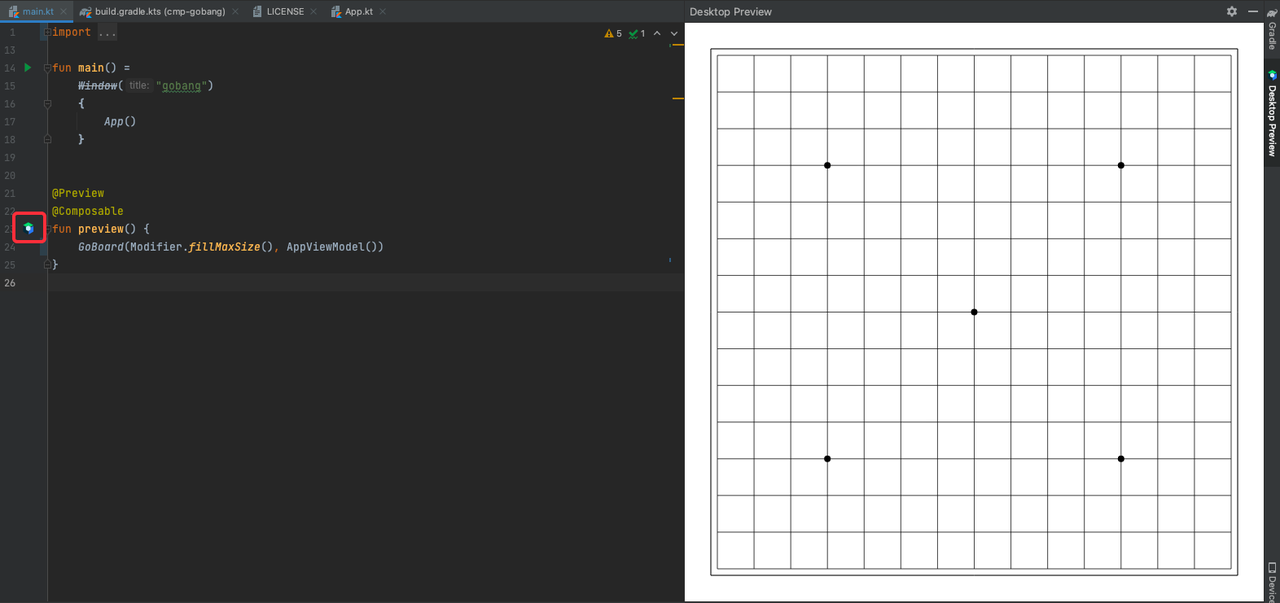 插件安装后,IDE中遇到 @Preview 注解时左侧会出现 Compose logo 的小图标,点击后右侧窗口可以像 AS 一样进行预览。