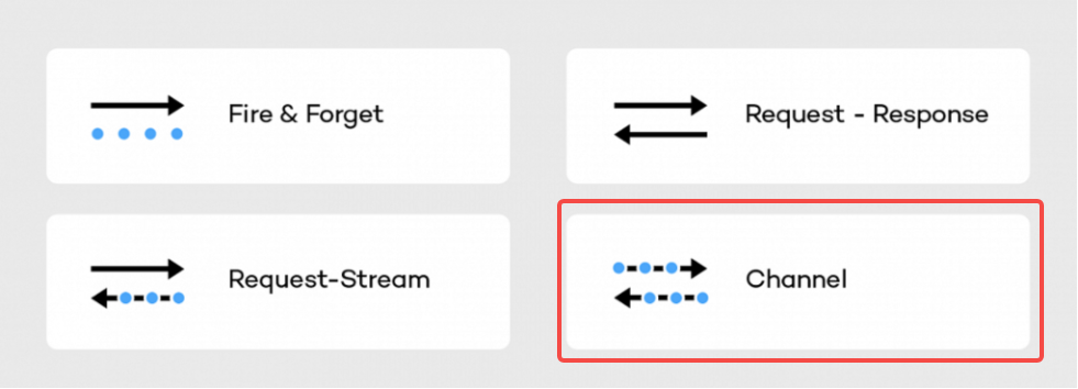 在游戏整体设计上,桌面端和移动端采取点对点通信。 RSocket 支持多种通信方式,其中 request/channel 可以提供全双工通信,非常适合 IM、 网络游戏之类的场景,可以用来完成我们点对点通信的需求。