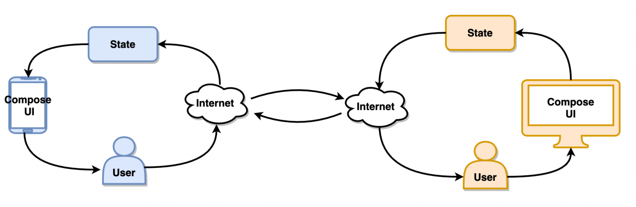 在参与合作的过程中,JetBrains 也看到了 Compose 在跨平台方面的潜力,Compose 良好的分层设计使得其除了渲染层以外的的大部分代码都是平台无关的,依托 Kotlin Multiplatform (KMP), Compose 可以低成本地化身为一个跨平台框架。