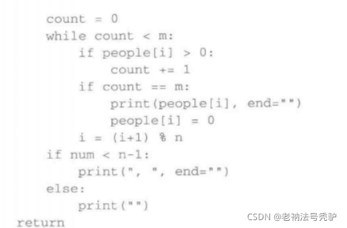解法1:基于Python的list和固定大小数组概念,将list看作元素个数固定的对象,只修改元素的值,不改变表结构。初始建立n个人的表,找到第k个人并开始算法,将表中元素修改为0的方式表示出列,直到n个人全部出列算法结束。m=1时,每次内循环时间开销O(n),m=n时,遍历一遍只能把count值加1,整个计算中时间复杂度为: