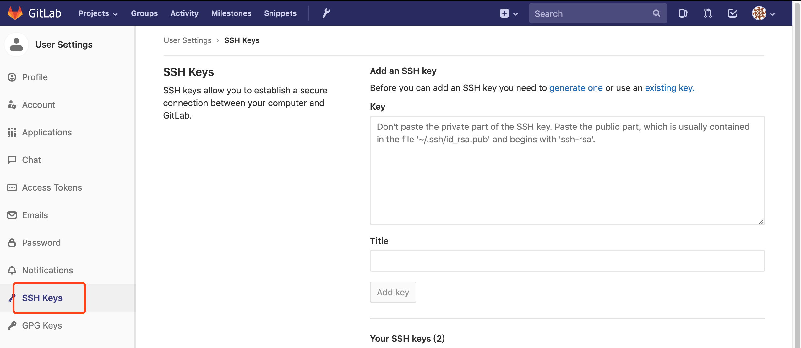 1、登录部署好的gitLab服务,将生成的密钥放置SSH Key,生成token