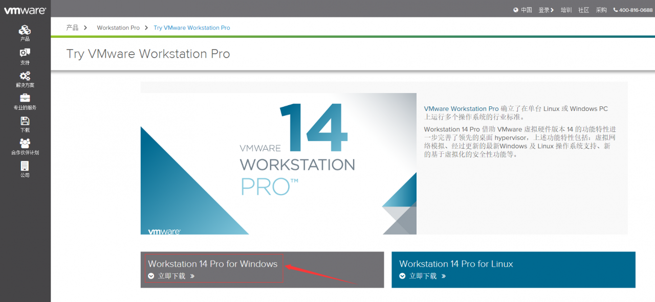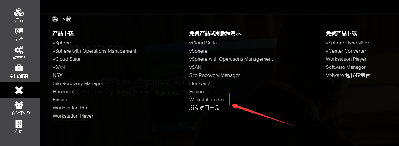 进入VMware官网,首先选择右边导航条的“下载”,然后选择免费产品试用版和演示板块的“Workstation Pro”进入VMware Workstation Pro下载页面,最后选择合适的版本点击“立即下载”。(安装好之后再进行激活操作)