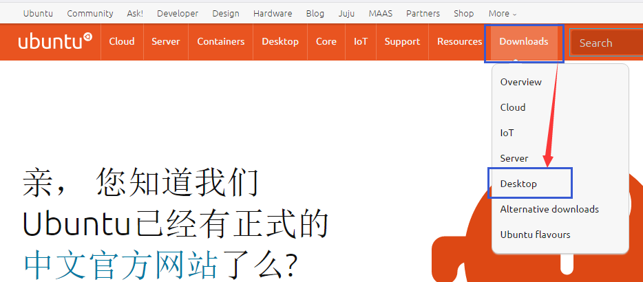 2、选择右上角的“Downloads”,在下拉框中点击“Desktop”进入Ubuntu桌面版下载页面;