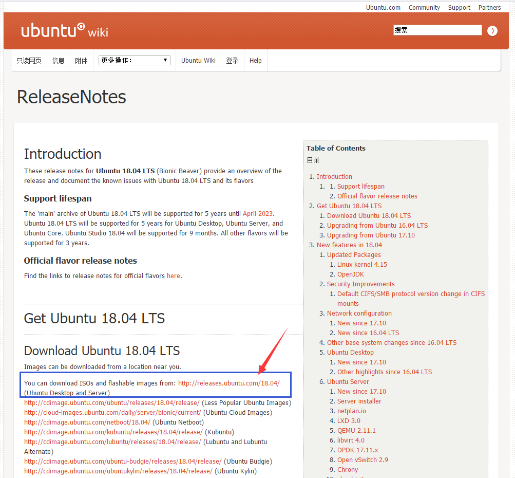 3.1、或者在Ubuntu桌面版下载页面点击“Ubuntu 18.04 LTS release notes”进入ubuntu wiki页面;
