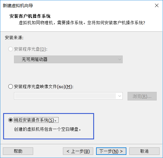 4、选择“稍后安装操作系统”,然后“下一步”;