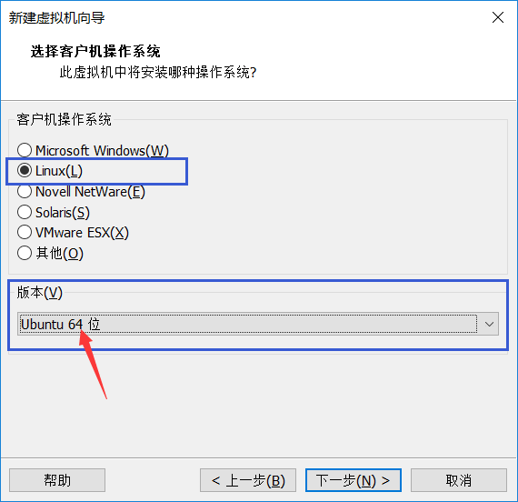 5、客户机操作系统选择“Linux”,由于我们前面下载的是64位的系统,所以此处版本选择“Ubuntu 64 位”,然后“下一步”;